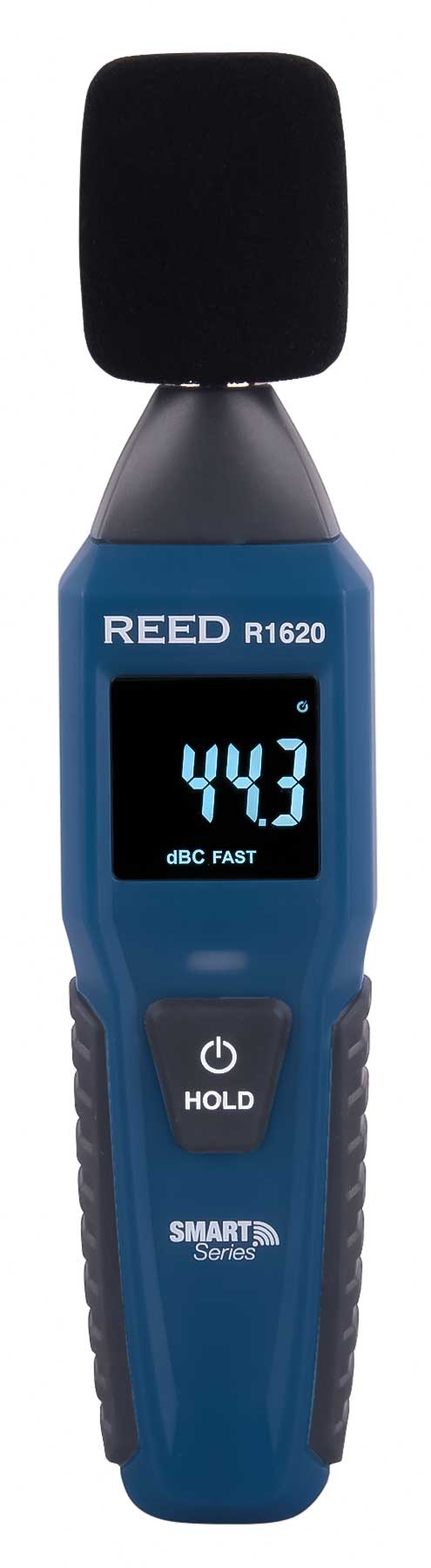 The R1620 is a compact sound level meter that can be used on its own or with the REED Smart Series app (available for download on Android and iOS). When connected to the app, the R1620 can be configured to record data over a set period of time.